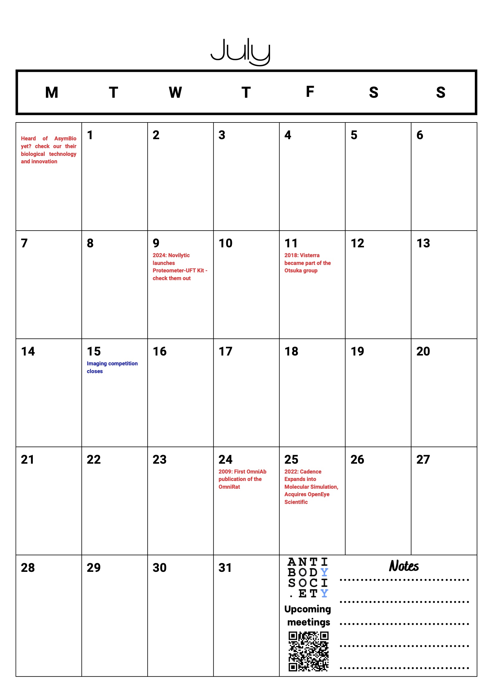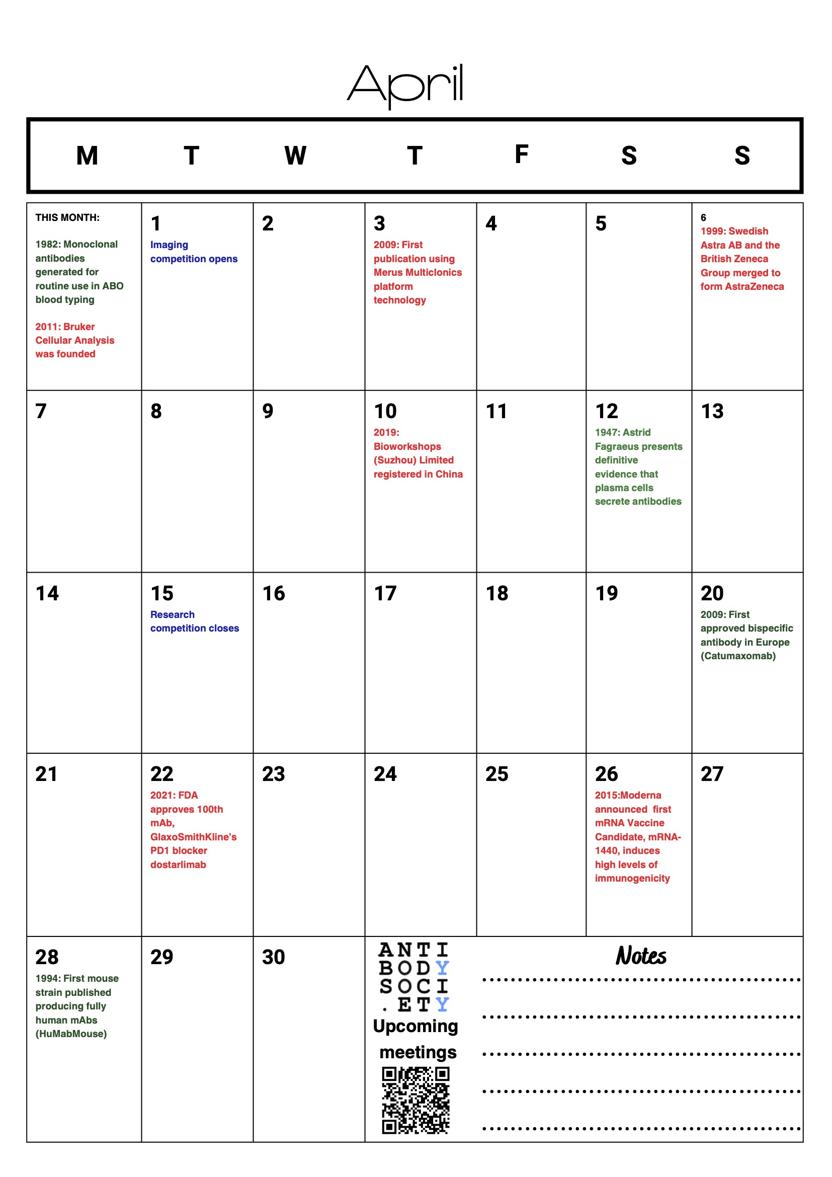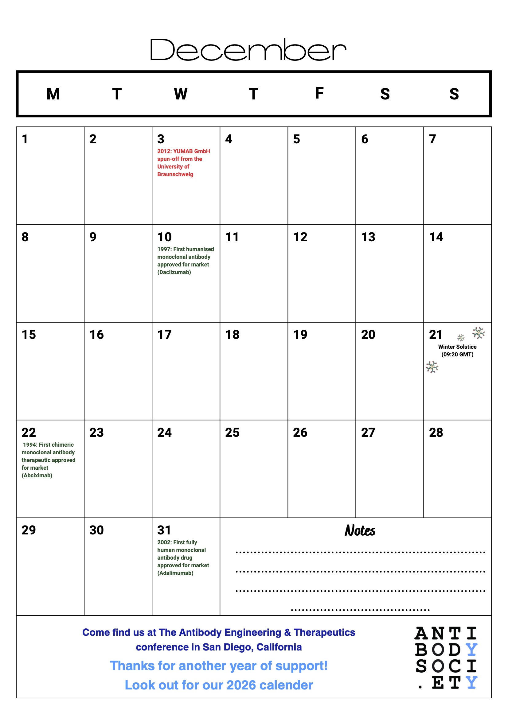 The Antibody Society’s Communication and Membership Committee has shortlisted 12 images from the Imaging Calendar Competition and is proud to share the amazing work of its members in the form of this stunning 2025 calendar.